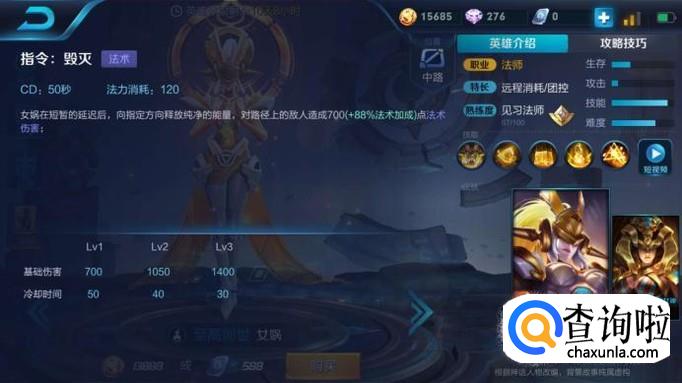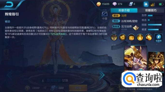 出装需要结合英雄技能特性,如图所示,女娲被动技能是辉煌指引,每升一级就会提升3%的视野,2%的普攻和技能释放范围,这就代表,女娲的手特别长,可以专注法强和法穿,也可以出一件贤者堆积血量;
