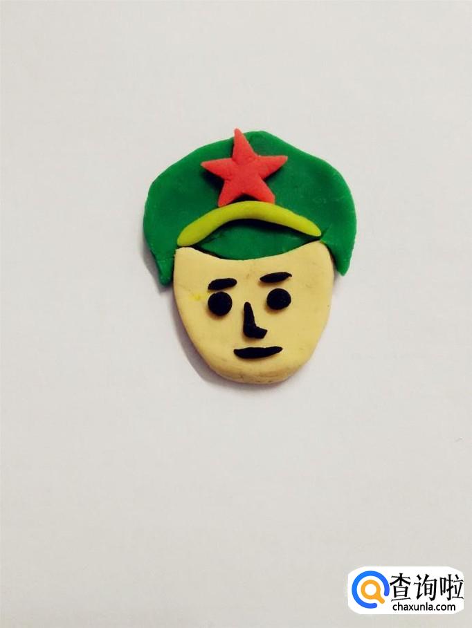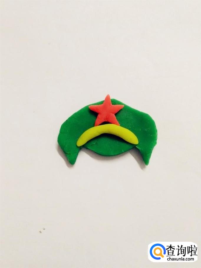 用一大块绿色,捏成一个象蝙蝠一样的形状,当作军人的军帽。
