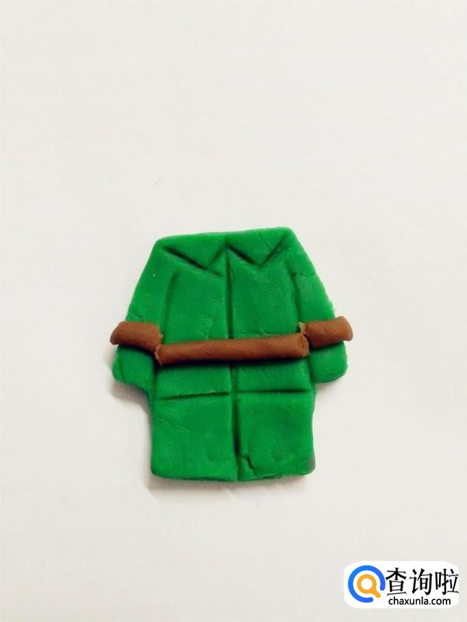 用一大块绿色捏成军人的身体,上面因为有胳膊,要宽一些。