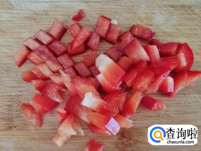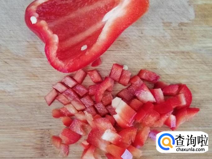 红色菜椒用清水洗净,去把去籽,然后切半个就够用,把红色菜椒如图所示,先切成丝,然后切成红色菜椒丁待用。