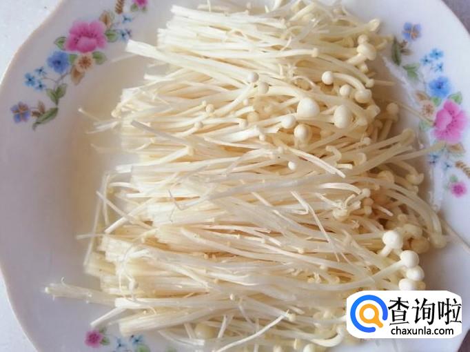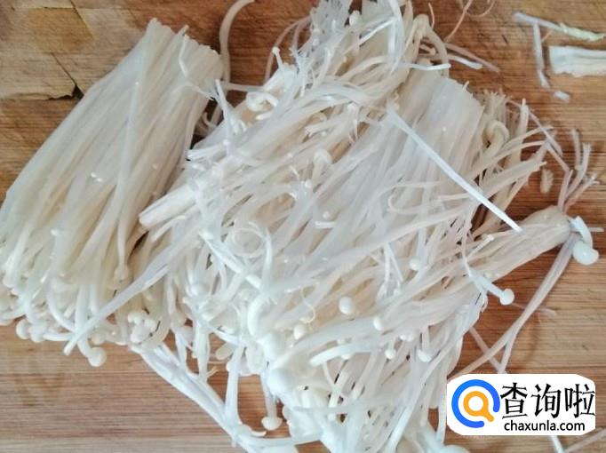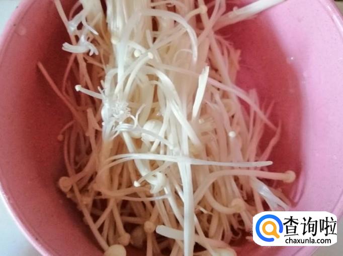 选用适量金针菇,用清水把金针菇洗净,然后切去根部,把粘在一起的金针菇撕开,处理好的金针菇放入盘中待用。