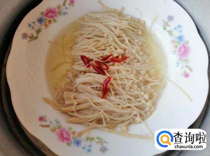 把处理好的金针菇,摆放整齐在盘中,加入切好的干红辣椒,放入蒸锅,盖上锅盖,大约蒸十分钟就可以了。