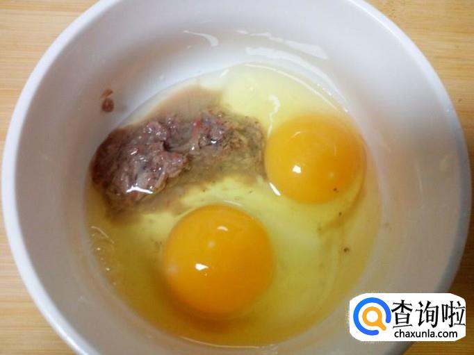 碗里放入一匙儿虾酱,放入两个鸡蛋,搅拌成虾酱鸡蛋液。