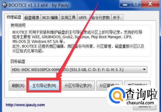根据情况选择好硬盘后,在该页面点击【主引导记录】。