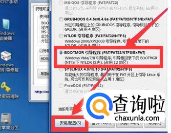 这个地方需要区分一下,根据你的实际情况来选择。旧版本的bootice软件的情况,电脑系统为XP的选择nt5.x,电脑系统为Win7的选择nt6.x;新版的bootice软件的情况,就不用管电脑是什么系统的,nt5.x和nt6.x混在一起,统一选择一项即可。选择完成后,点击【安装/配置】即可。