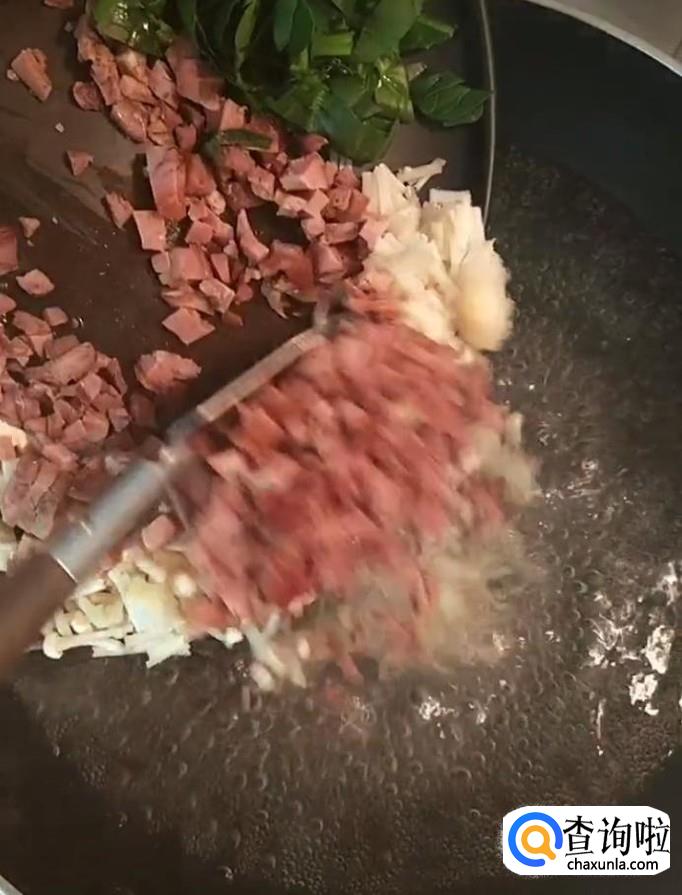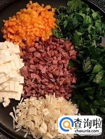 首先,我们将熟牛肉,豆腐,菠菜,金针菇,香菜分别切丁备用