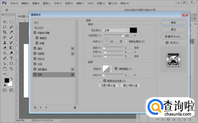 然后,我们给文字图层添加一个投影,参数如图所示。