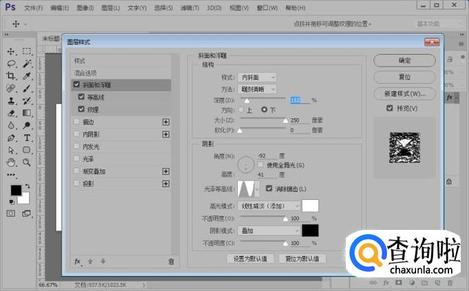 输入文字之后,我们在图层面板的下面找到添加图层样式的按钮并点击,首先添加图层样式斜面和浮雕,参数如图。