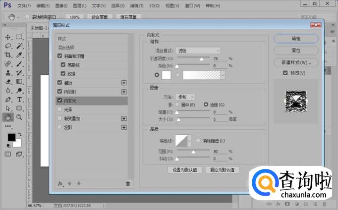接下来,我们给文字图层添加内发光的图层样式,参数如图。