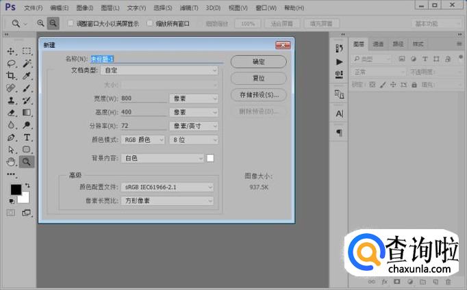打开ps软件之后,我们新建一个画布(选择文件-新建或者是快捷键Ctrl+N都是可以的),小编就新建了一个800*400的画布给大家做示范。