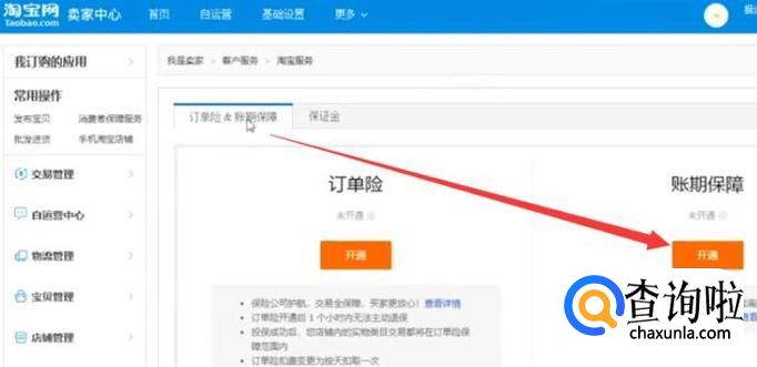 接下来我们点击订单险,账期保障选项,如下图所示,并点击开通按钮
