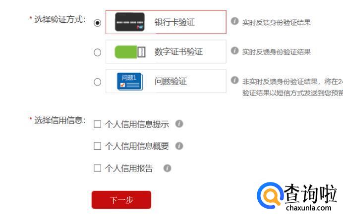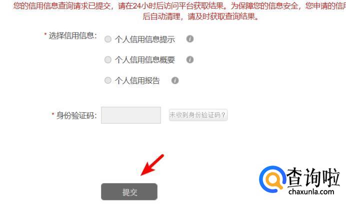 接收到身份验证码后选择获取信用信息,然后选择个人信用报告,输入身份验证码,点击提交。