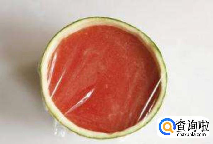 最后把搅拌均匀的西瓜汁倒入西瓜壳里面就可以,用保鲜膜裹好放入冰箱冷冻一段时间就成型了。