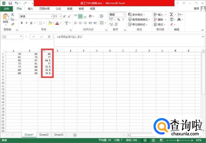 然后点击单元格右下角的黑点,当光标出现加号的时候,往下拉,即可求出所有行的平均数。
