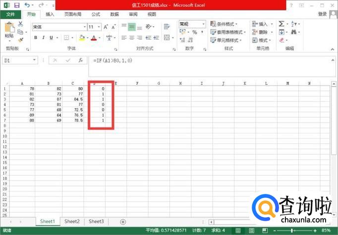 最后即可看到,A列大于80的显示为一,否则显示为零。