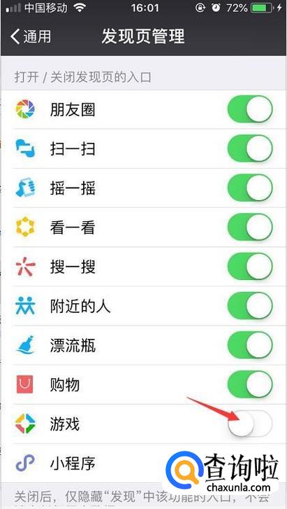 最后我们只要把游戏的入口打开即可,再返回到发现就可以看到游戏中心了。