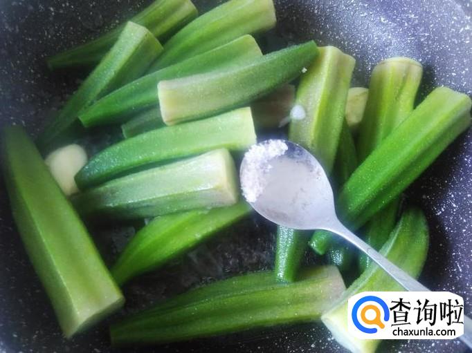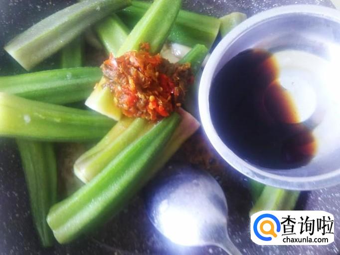 然后放秋葵进去,加适量的盐、酸梅紫苏辣椒酱,生抽。