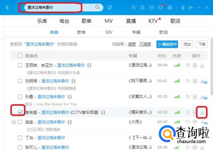 安装完成后打开,我们开始下载歌曲,如图所示,先在上方搜索栏输入想要下载的歌曲名称,找到资源后,勾选一下,点击下载按钮。
