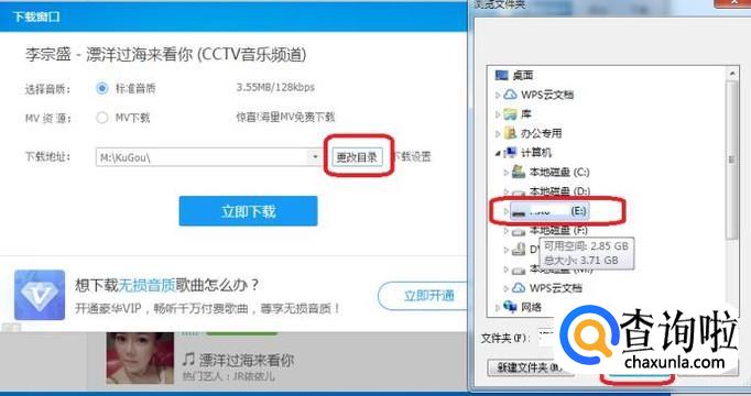 登录后就可以下载了,如图所示,选择音质后,我们点击“更改目录”按钮,把下载地址改成我们的u盘,点击确定,立即下载就可以了。