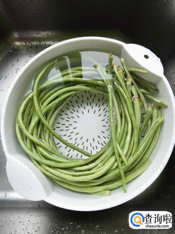 首先我们需要去除掉豇豆的豆筋,然后用清水把豇豆清洗干净,放在架子上控干水分备用。