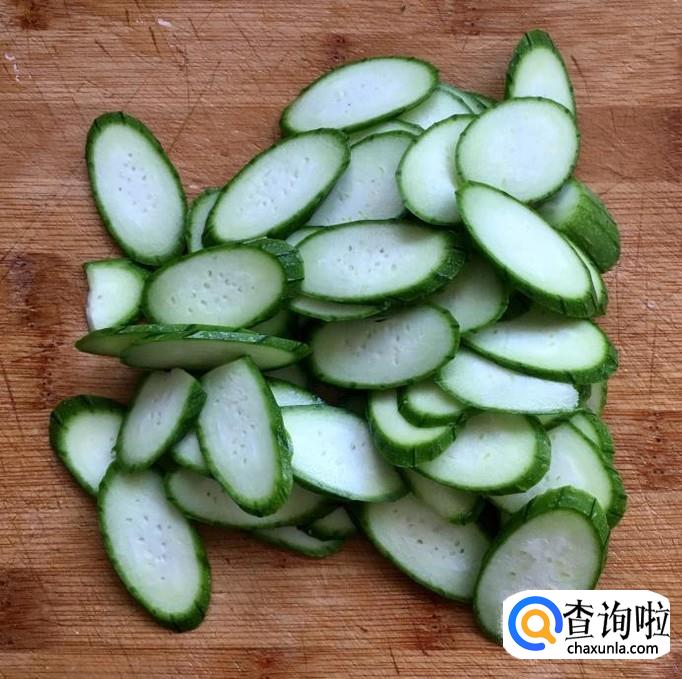 鲜嫩的丝瓜三根清洗干净切掉两端,然后切成厚薄均匀的丝瓜片。鲜嫩的丝瓜可以连皮一起吃。