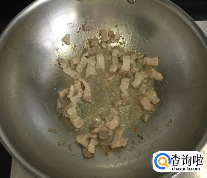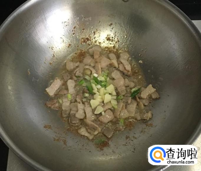热锅加入适量的花生油把五花肉片炒香并出油,放入葱花、蒜片爆香后烹入料酒