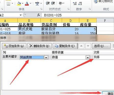 3、弹出排序对话框,在主要关键字后面选择将要作为分类汇总依据的列标题,再选择要升序还是降序,最后按确定。(升降都没关系,主要是必须将相同的类别放一起,才可进行分类汇总。)