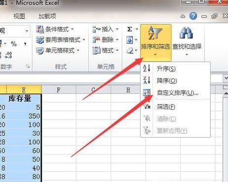 2、然后点击开始选项卡中的排序和筛选功能,在弹出的下级菜单中点击自定义排序。