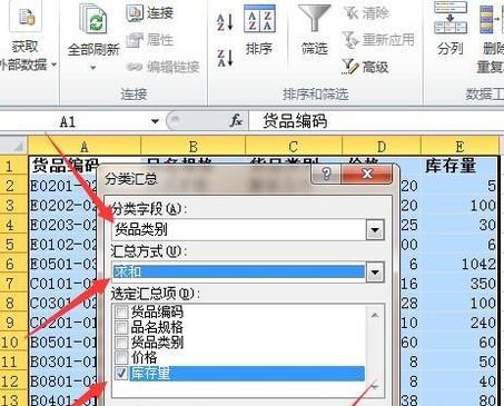 5、在对话框中选择分类字段(即分类的依据),再选择汇总方式如求和,再勾选汇总项,如库存量。最后按确定。