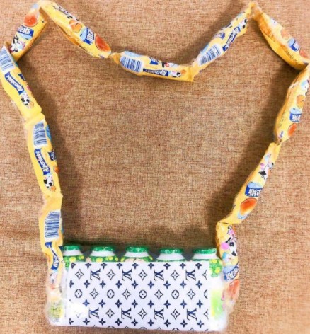 2、然后将棒棒糖作为宝宝的带子,奶作为包包,用胶带粘在一起即可。