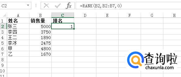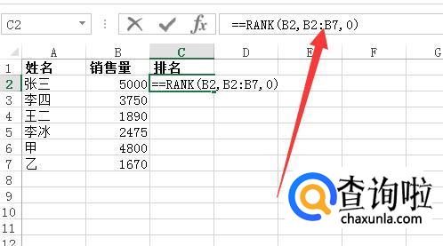 我们在C2单元格中输入:=RANK(B2,B2:B7,0),B2表示需要排序的单元格,B2:B7表示所有需要排序的单元格范围,0表示从高到低排序(注意:0或者不写就是从高到低排序,非0就是从低到高排名。从高到低的意思是,数值越大,名次越靠前,反之亦然。)
