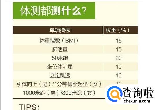 体重15%,肺活量15%,50米跑20%,坐位体前屈10%,立定跳远10%,引体向上(男)/1分钟仰卧起坐(女)10%,1000米男/800米女20%。
