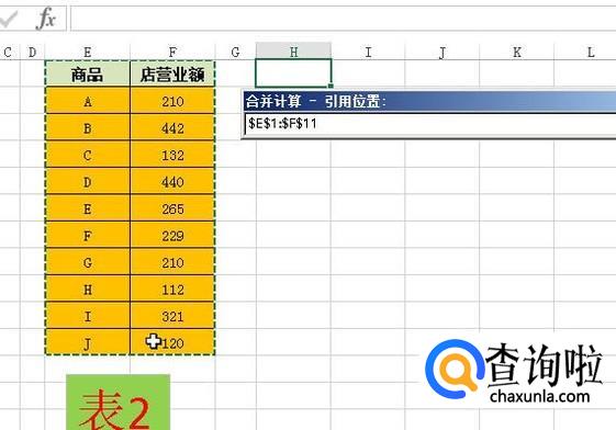 点添加后,再在引用位置这里选中表2中的“A1:F11”;接着,在“标签位置”这里两项都勾选上。再点确定。那么,两张表格数据即合并了数据。