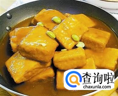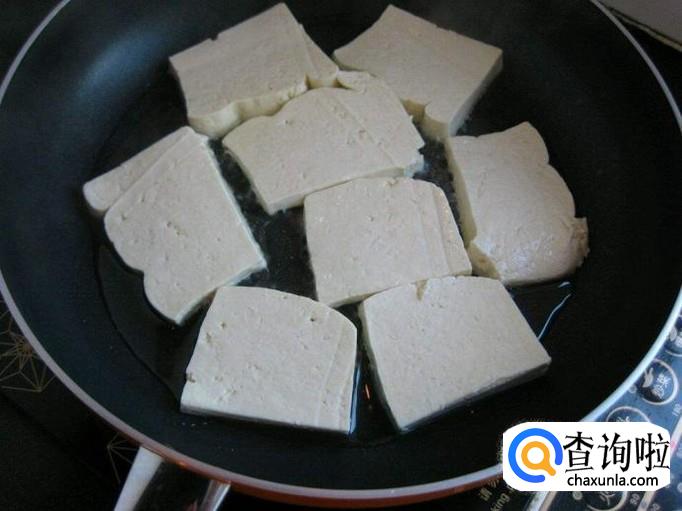 锅中倒入适量油,油热将北豆腐慢慢放进去锅中,煎至整个北豆腐都是金黄色,捞起备用。