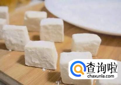 准备好一大块北豆腐,泡盐水10分钟,切片备用