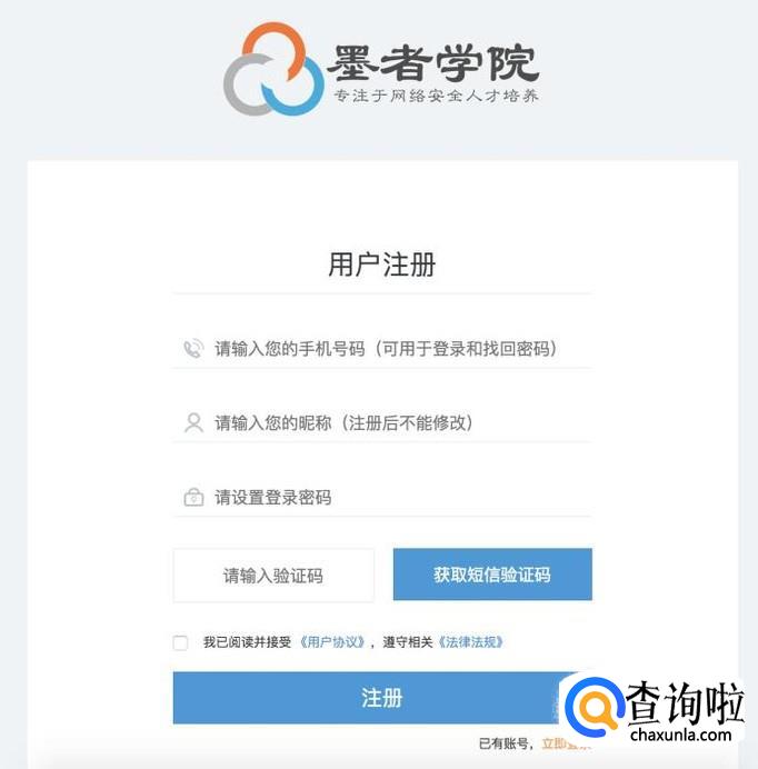打开墨者学院网站,点击右上角注册按钮,注册成为新用户。