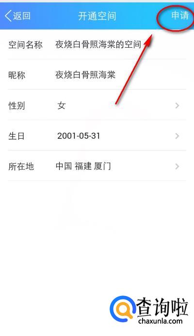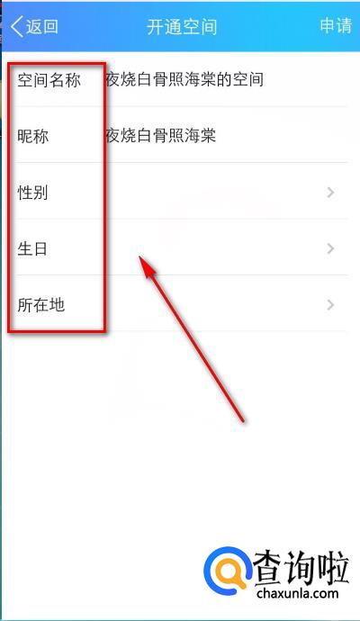 输入相关的信息,包括空间名称、昵称、性别、生日和所在地。