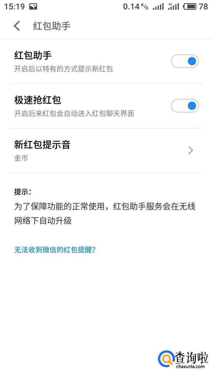 点击进入后打开提示音、红包助手、极速抢红包,在有红包时不仅有提示音,而且会自动跳到红包界面。