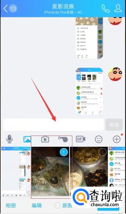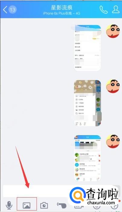 打开手机QQ,随便点击一个聊天窗口,选择发送照片图标,如下图所示;