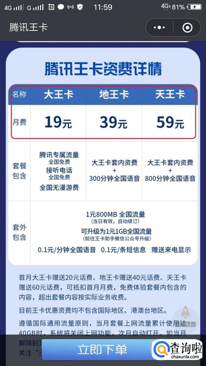 再来看看腾讯王卡的资费标准,王卡分三种套餐,分别是19元、39元、59元,可以说和阿里宝卡的内容是相当类似的。