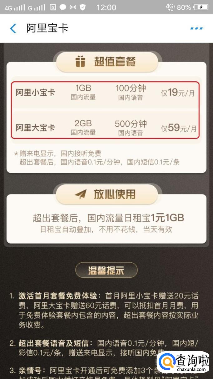 首先,我们来看看阿里宝卡的资费标准。宝卡分小宝卡和大宝卡两种,资费分别为19元和59元,不同的地方主要是国内流量和国内语音时长。