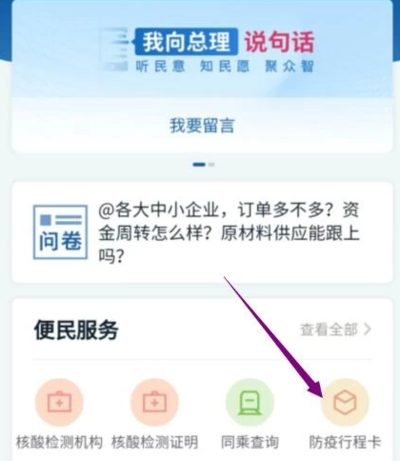 3、进入“国务院客户端”小程序后,点击防疫行程卡。
