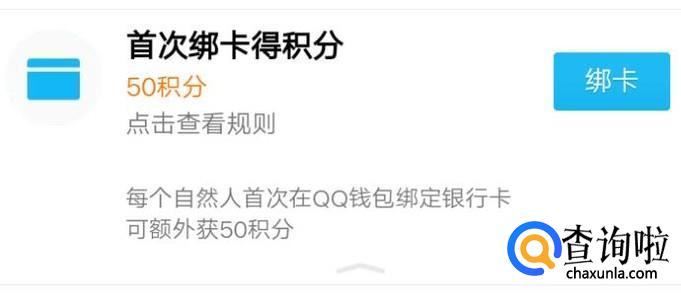 然后,我们在使用QQ钱包的时候如果我们首次绑定银行卡,也可以获得50积分。