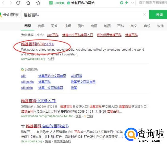 首先,打开电脑里的浏览器,在搜索框里输入【维基百科】,点击结果中的【维基百科】,如图所示