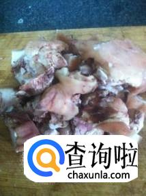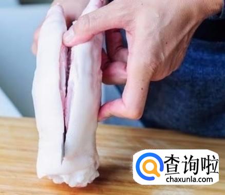 把猪蹄洗净且无毛的情况下平放在菜板上,用快刀从猪蹄背部自两个脚趾中间下刀,直到快要划为两半为止