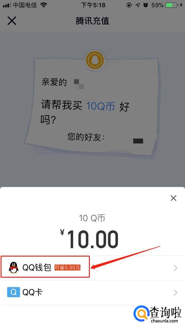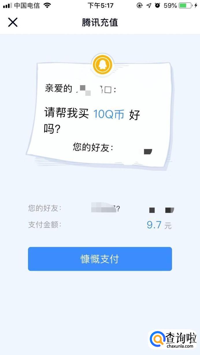 点击进入该消息之后,会出现如下的页面,点击“慷慨支付”,即可开始向好友送Q币。