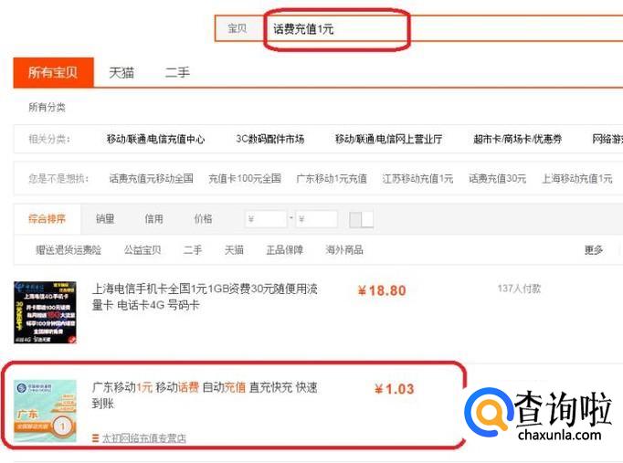 然后我们就可以搜索了,如图所示,在搜索框输入“话费充值1元”,能搜索出很多的店铺可以提供充值服务,我们选一家便宜点的就行了。