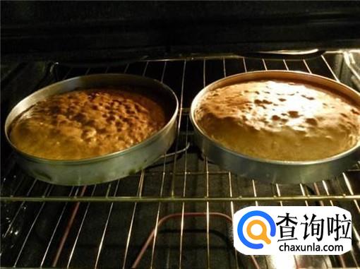 然后,我们将调制好的蛋糕面糊,倒入烤蛋糕的烤盘中,放入烤箱,开始烤制。