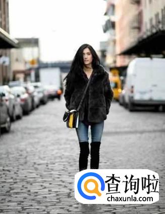 长靴搭配短款皮草,内搭短款毛衣,下半身穿一条深蓝色牛仔裤,这样看起来也是时尚有型。