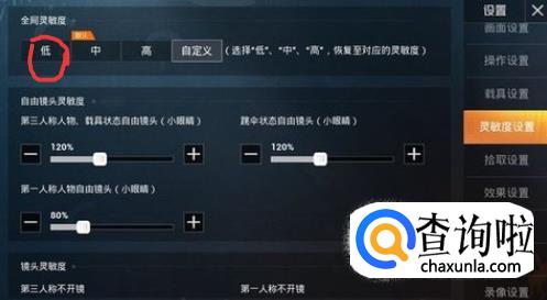 对于才开始玩这个游戏的朋友们,我的建议是灵敏度不要调的太高,因为才开始玩的时候玩家还不熟练动作都比较慢,灵敏度太高它不好掌握,建议把灵敏度调的低一点,所以在全局灵敏度那里我们设置为低。